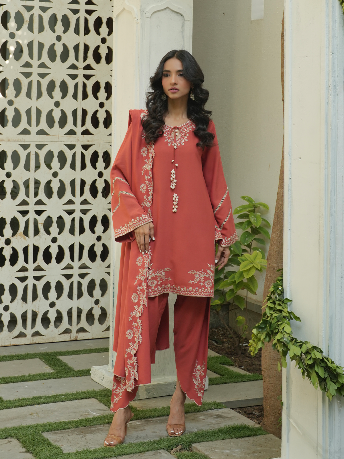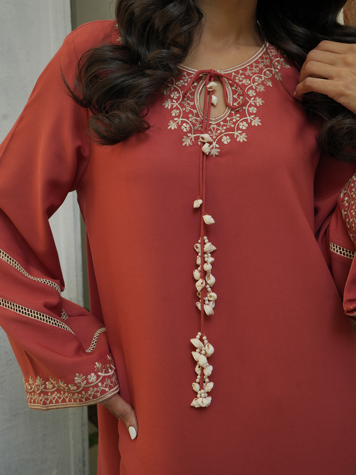 A coral colored embroidered set complete with shell adorned tassels, cutwork linen embroidered dupatta and shalwar.