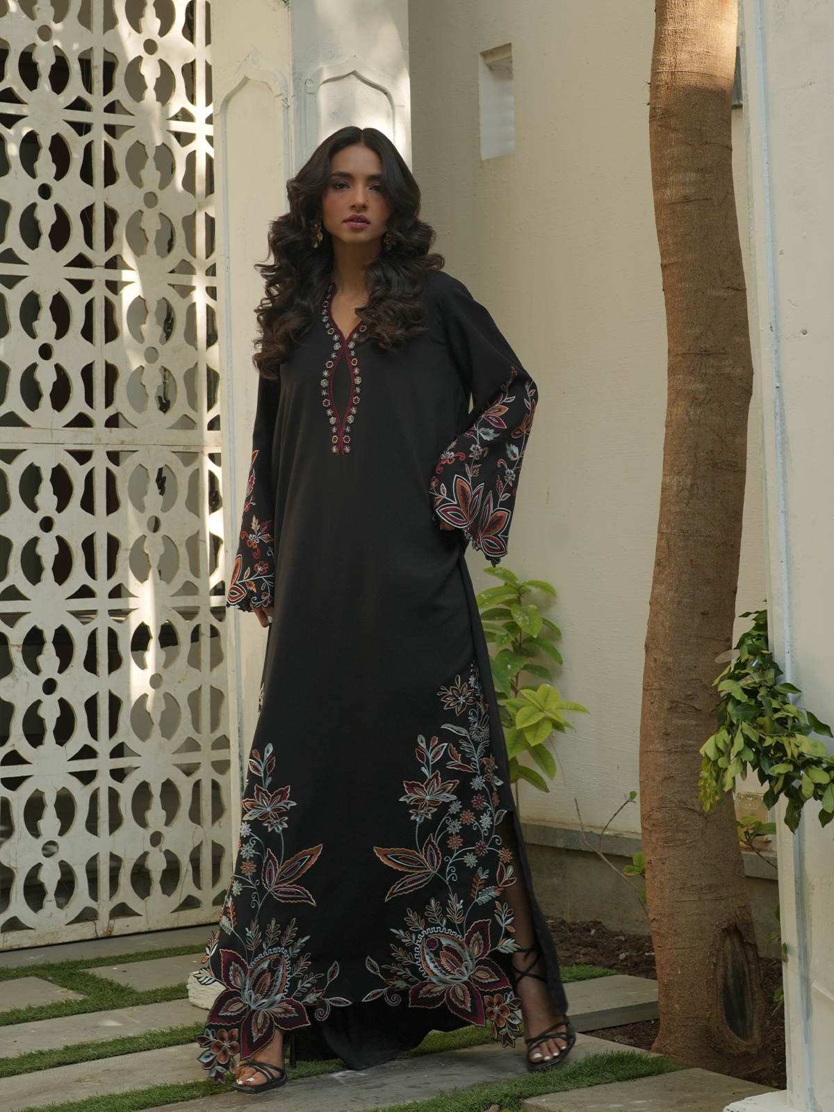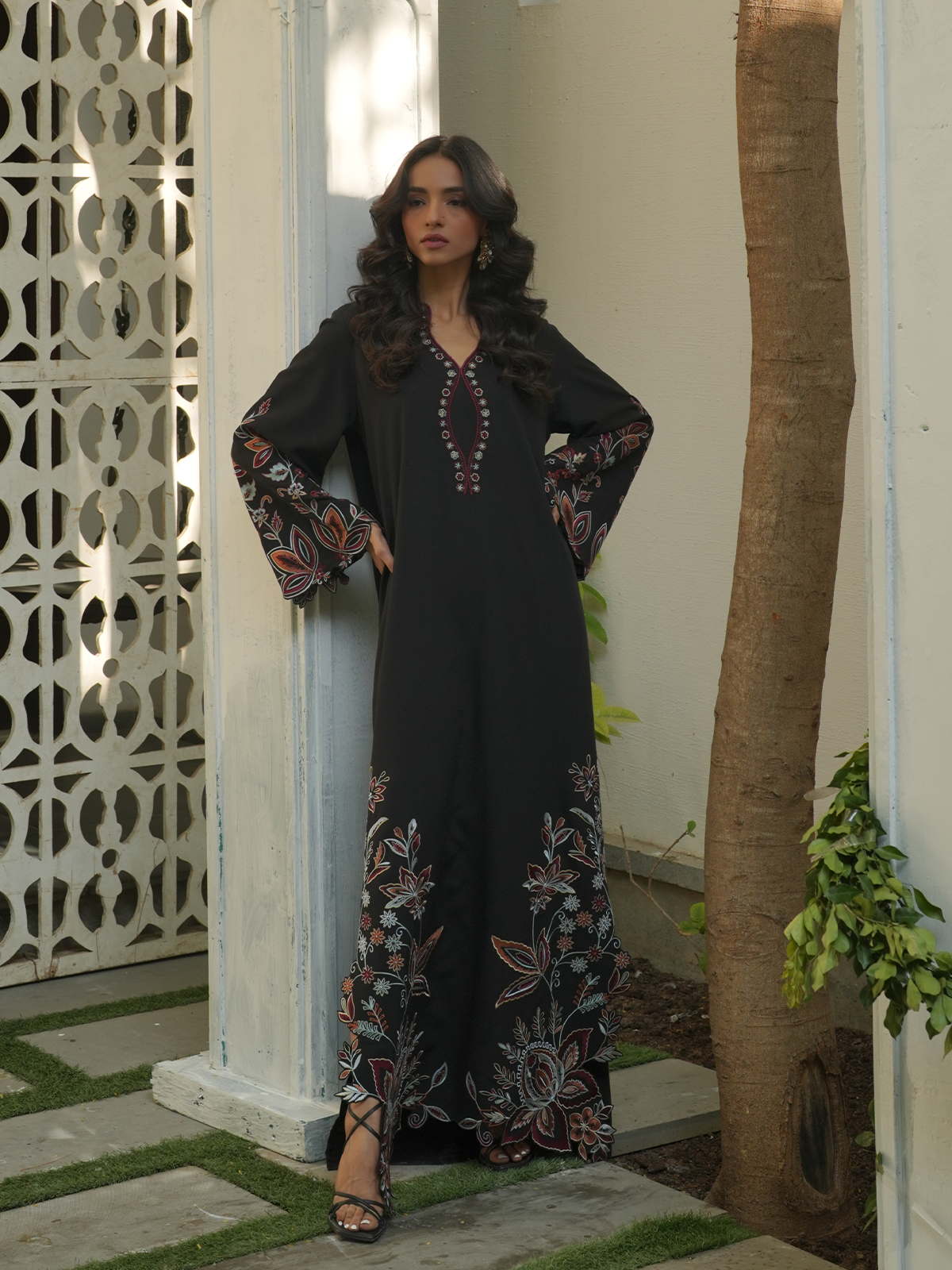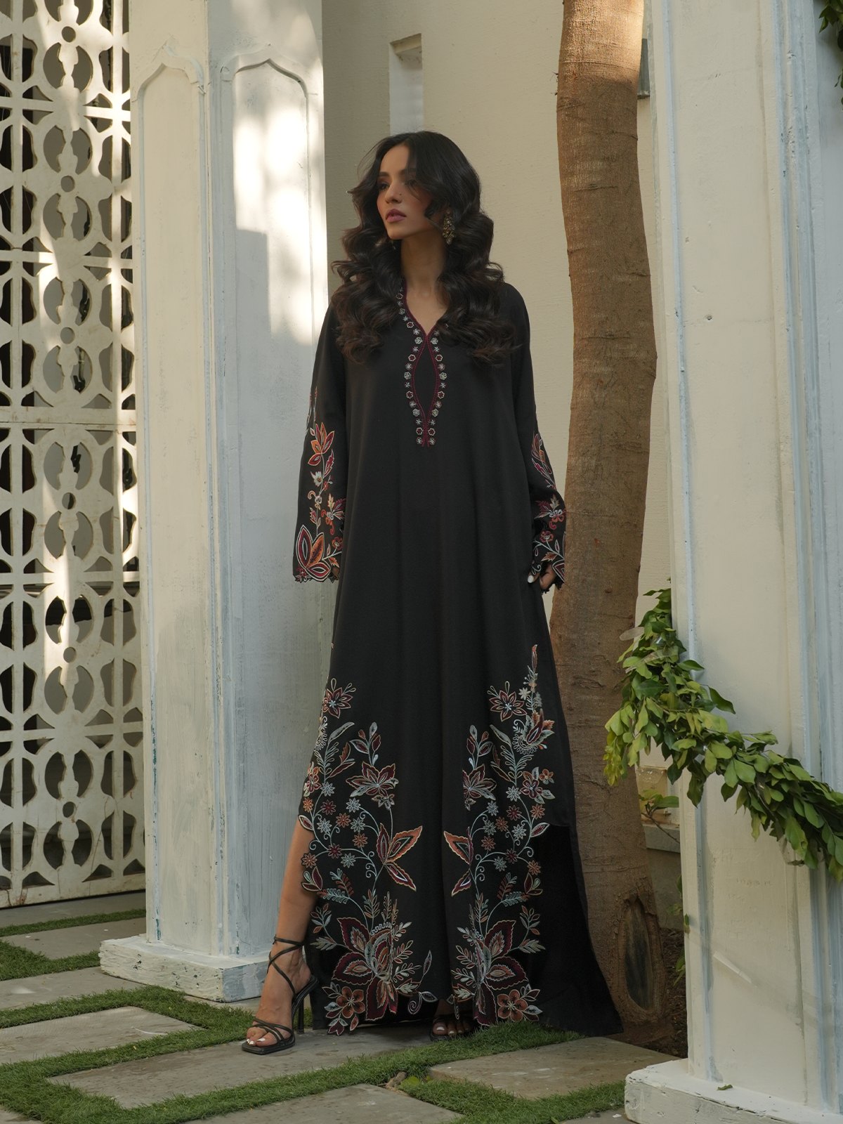 A black linen kaftan complete with multicolored embroidery and cutwork detailing.