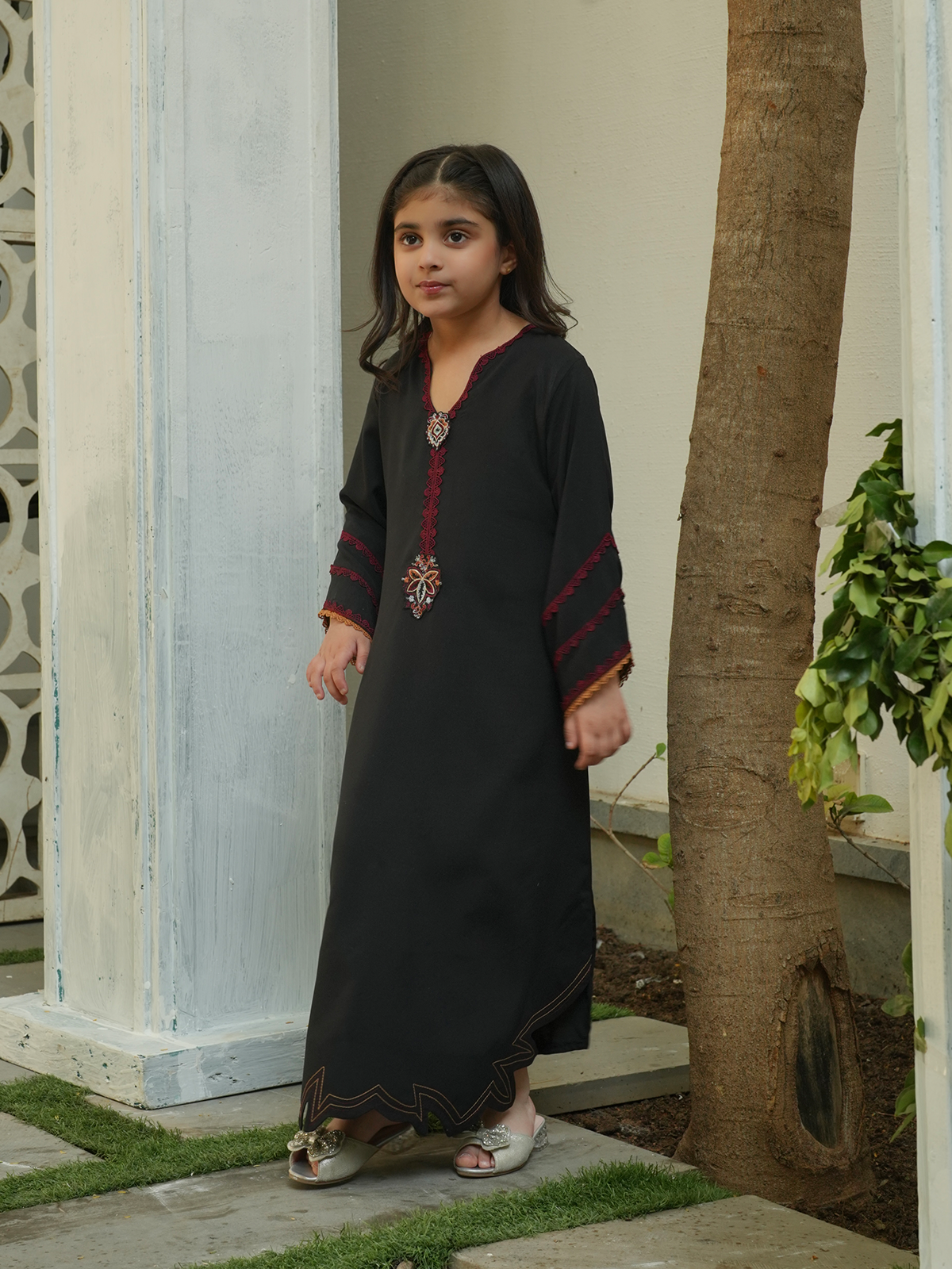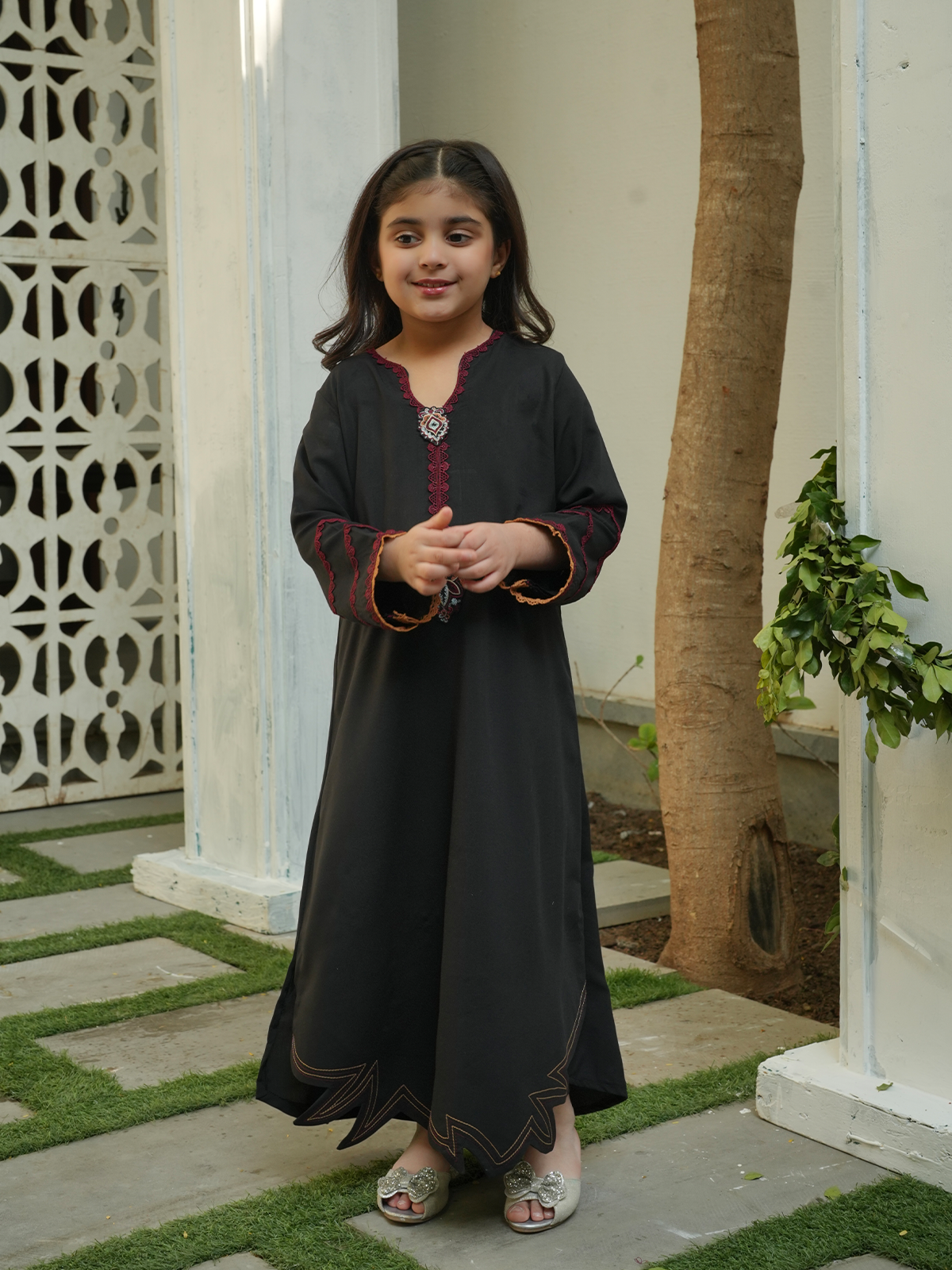 A black linen kaftan complete with appliqué, lace and cutwork detailing