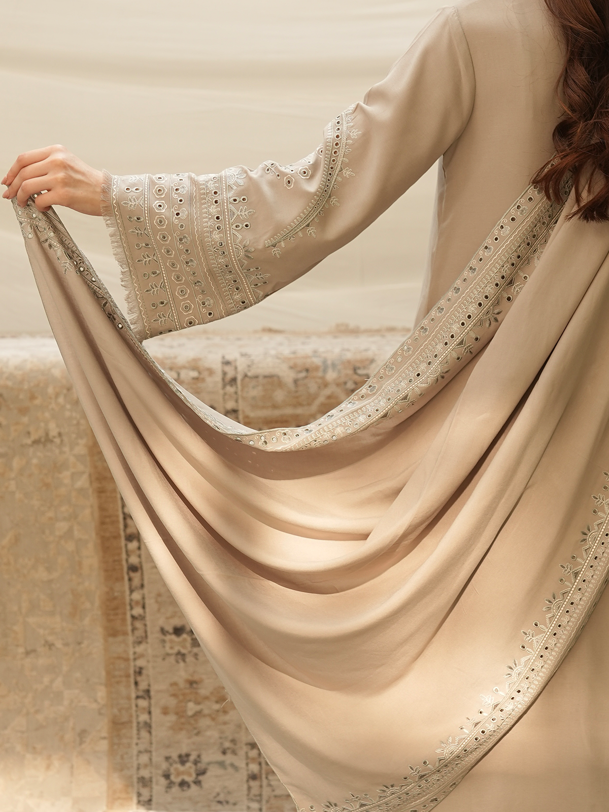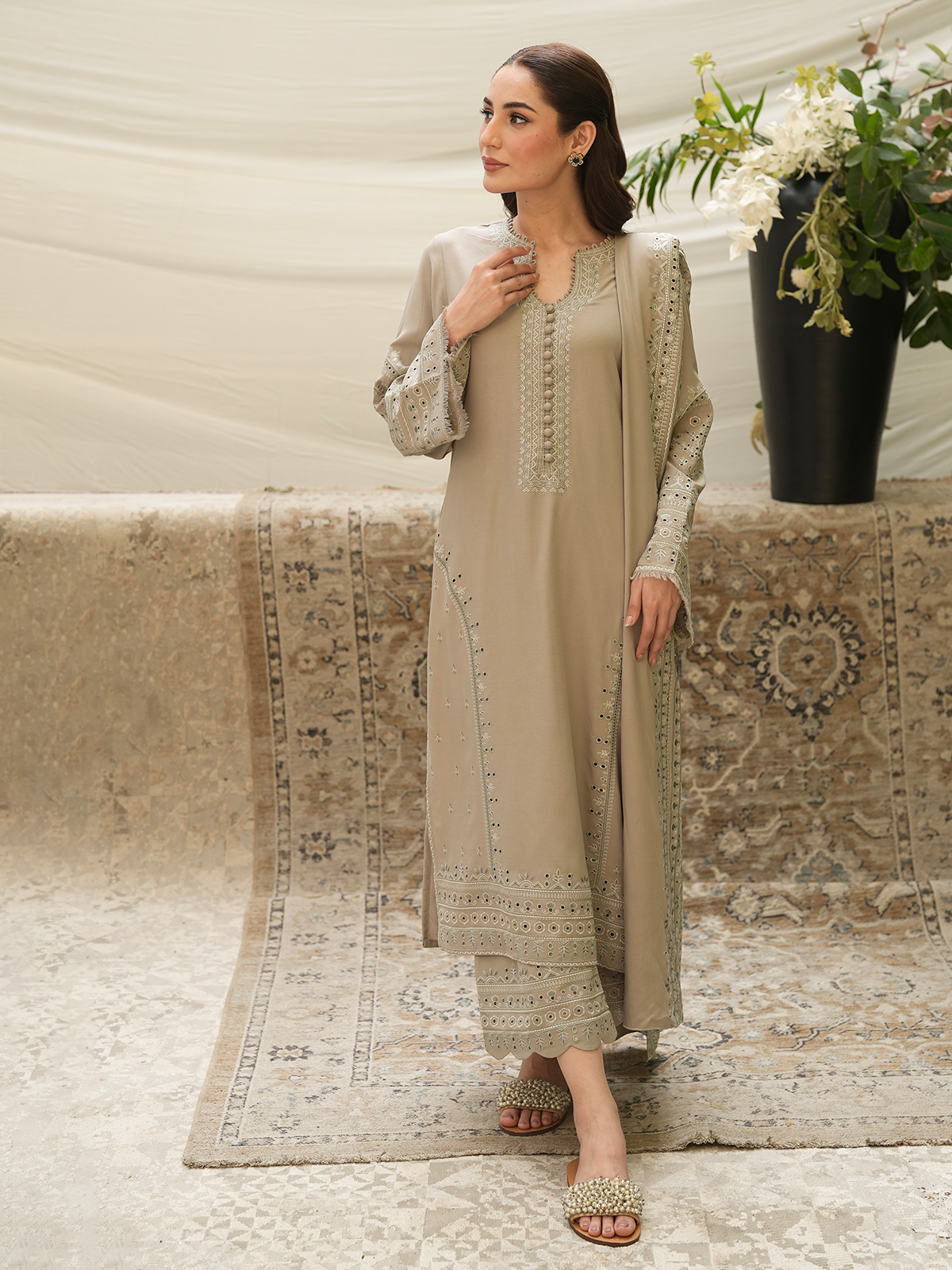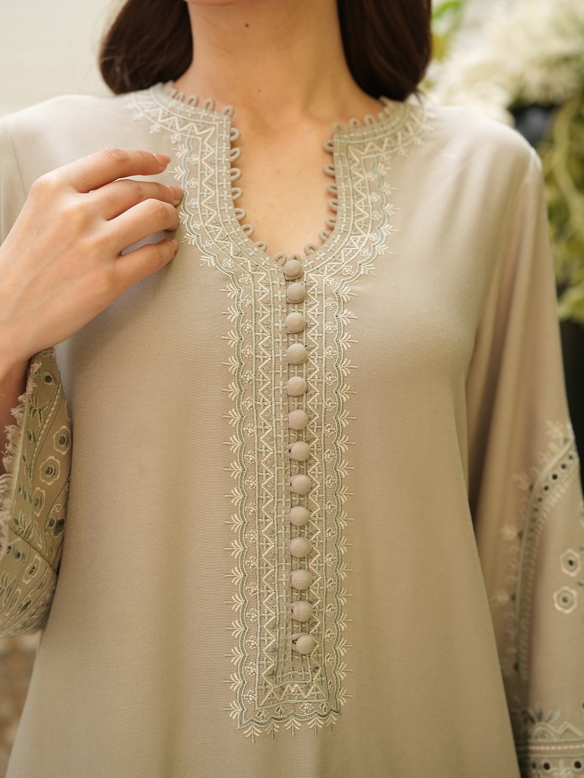 A grey linen set with embroidery in shades of grey and ivory, embroidered azaar pants and an embroidered linen dupatta