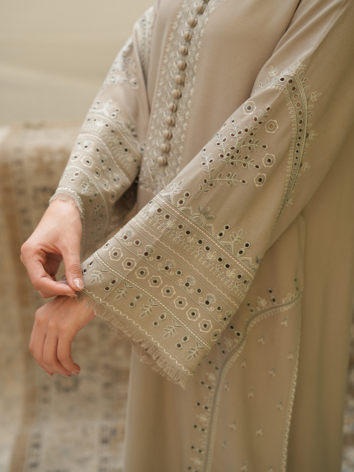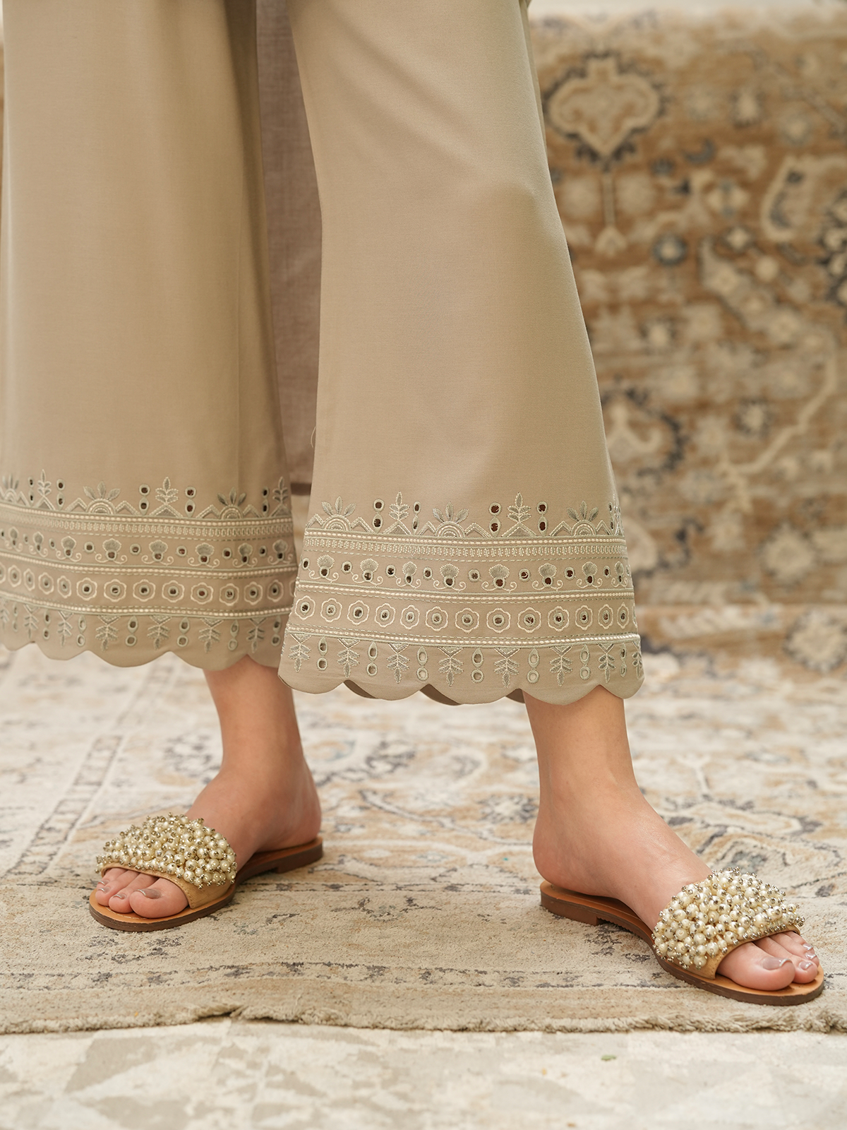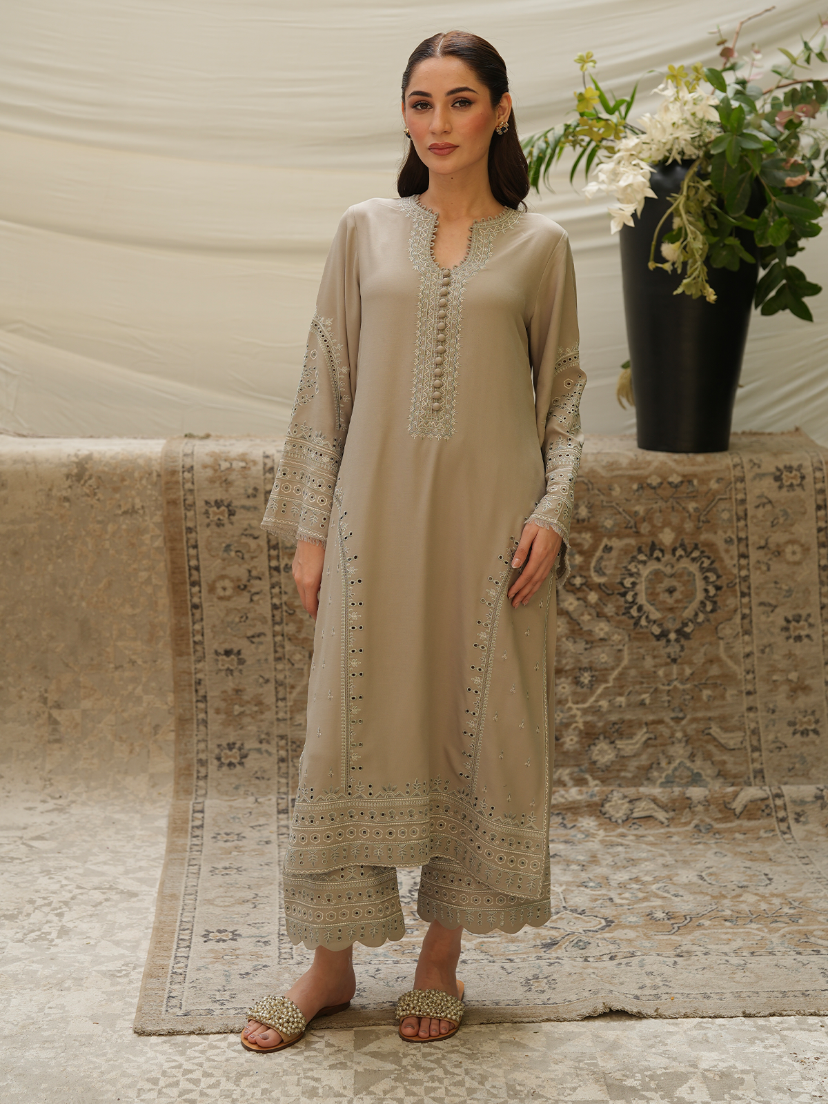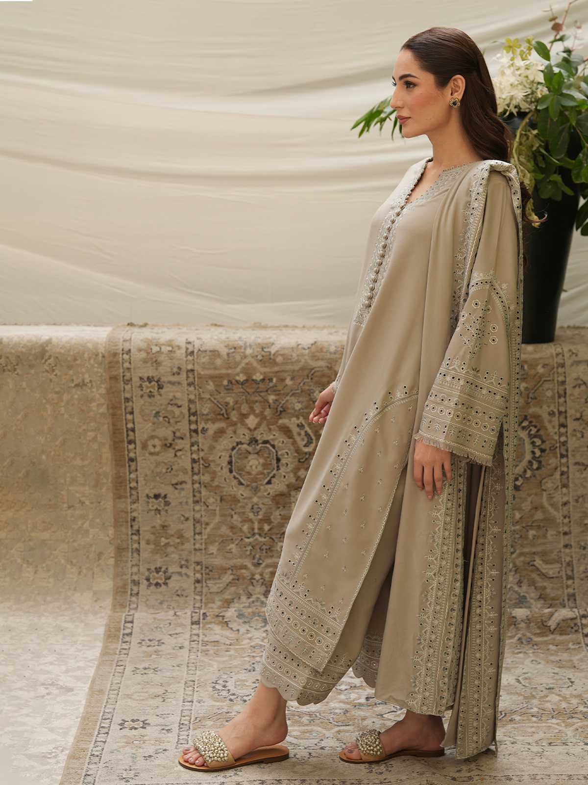 A grey linen set with embroidery in shades of grey and ivory, embroidered azaar pants and an embroidered linen dupatta