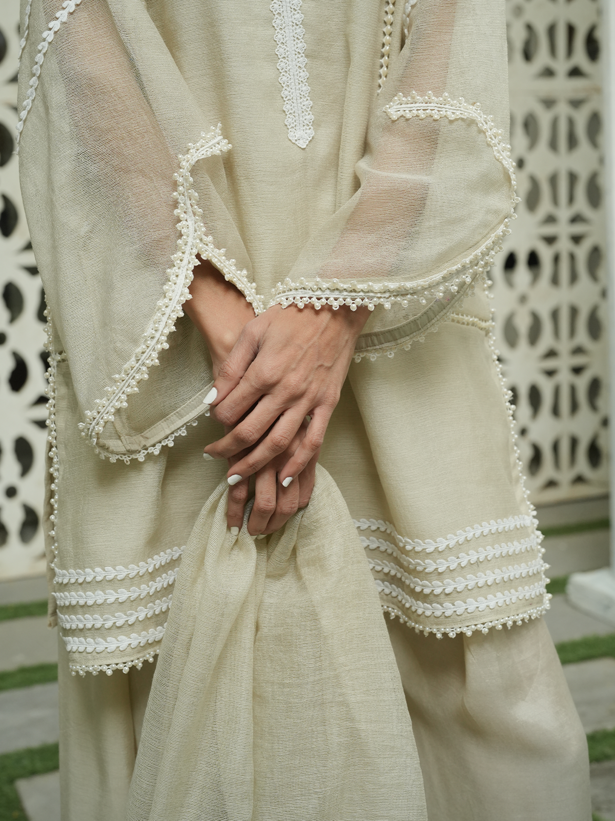 A beige cotton net set complete with white laces, cotton net lace embellished dupatta and a pleated cotton silk farshi shalwar