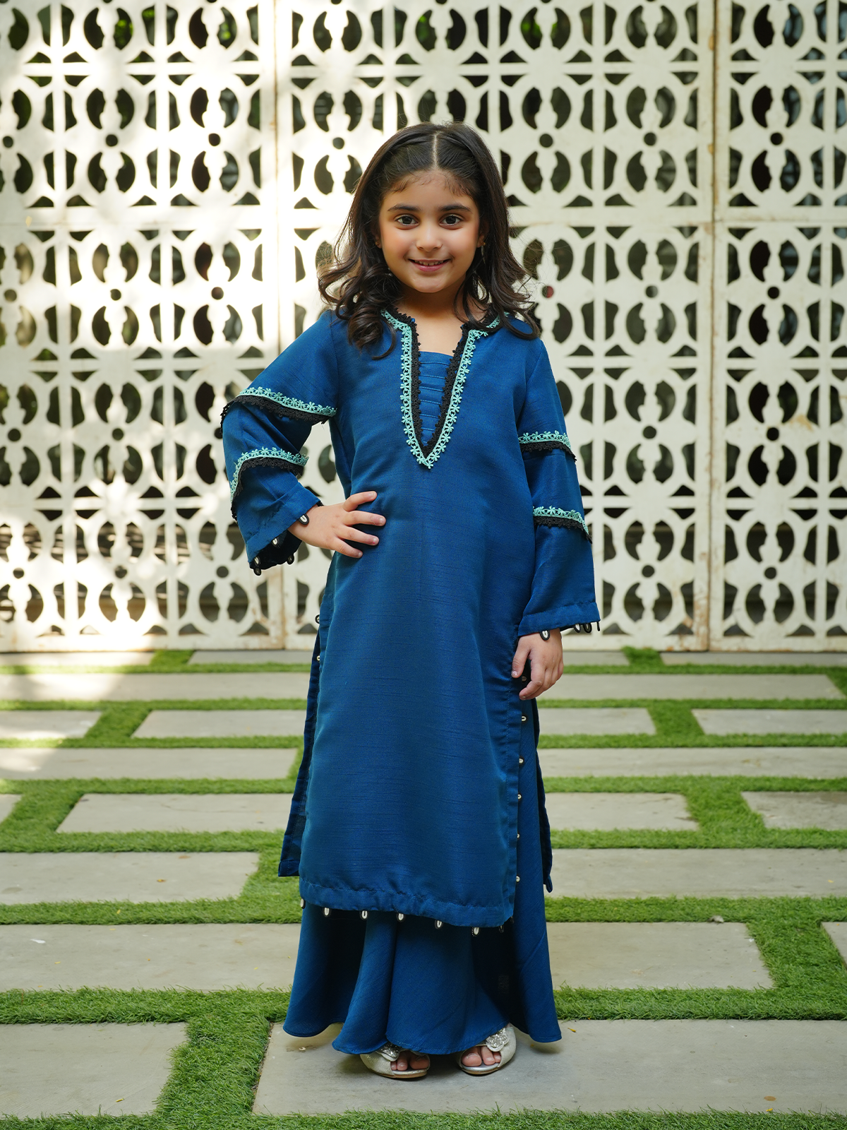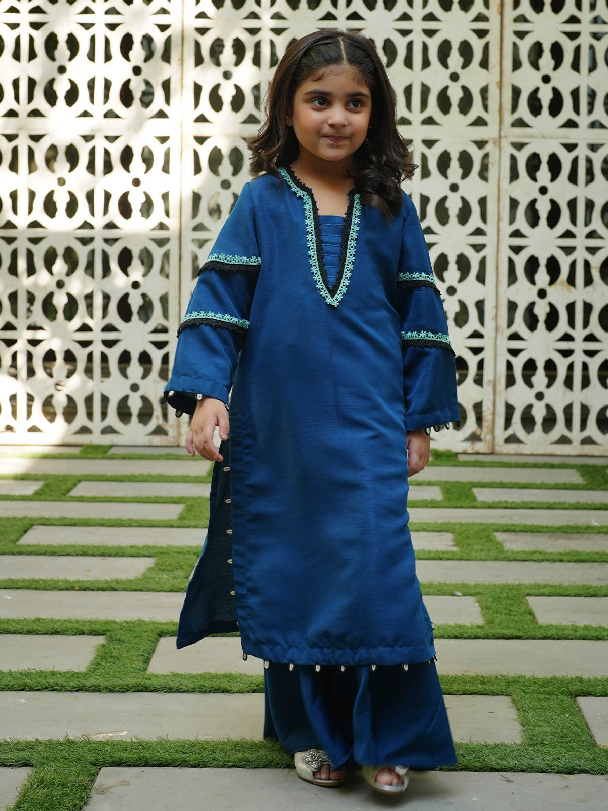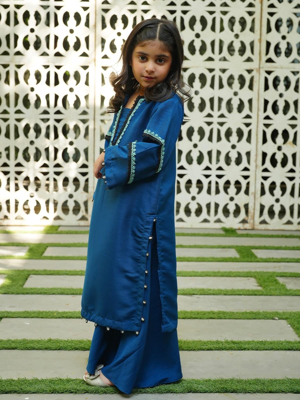 A teal raw silk set with two toned lace detailing, loop buttons and Dhaka pajama.