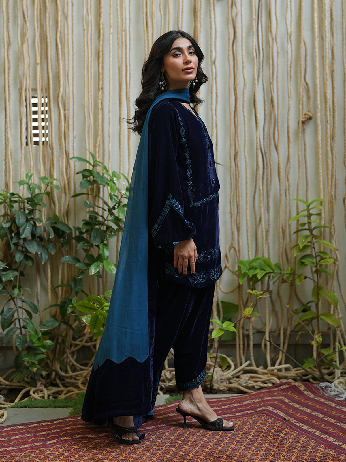 A midnight blue velvet set complete with teal embroidery details, complete with an embroidered skinny shalwar and a teal chiffon dupatta with velvet detailing.