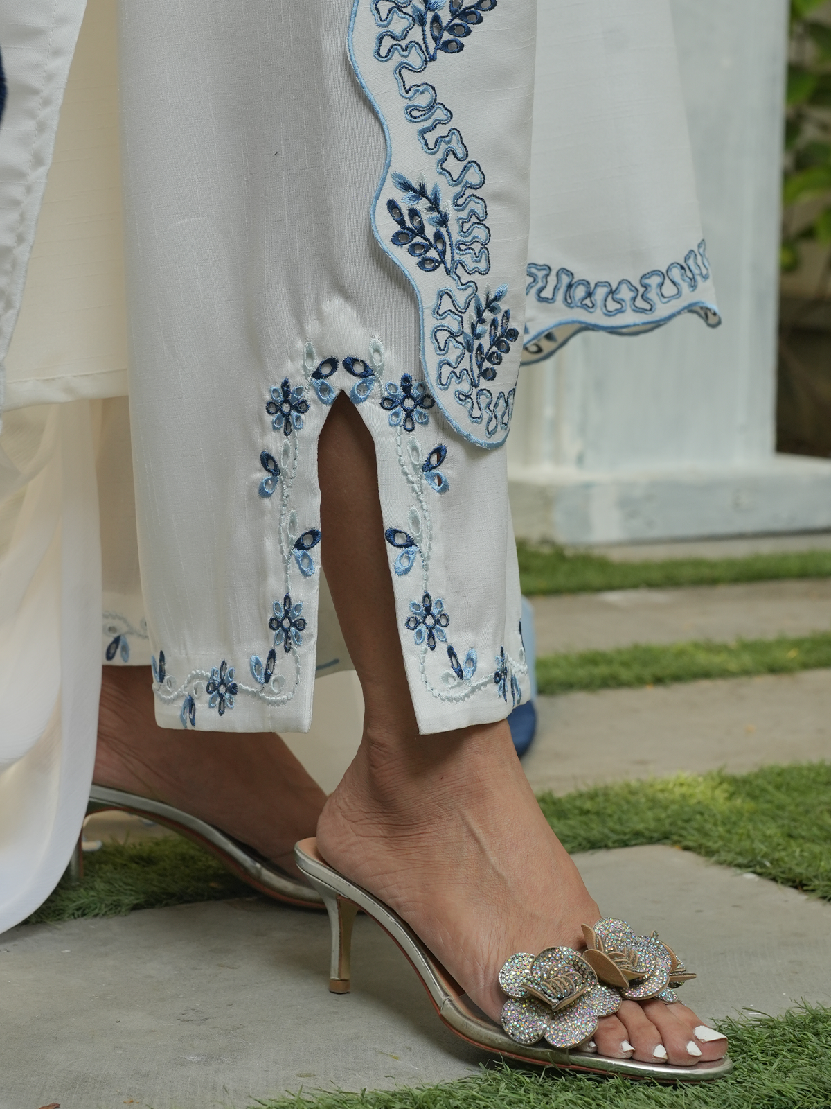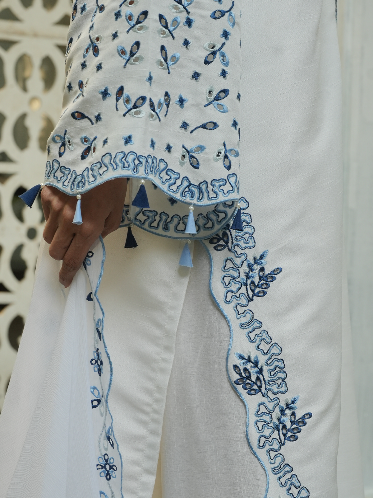 An embroidered raw silk set complete with cutwork detailing, borring embroidery, pants and a chiffon dupatta with organza detailing.