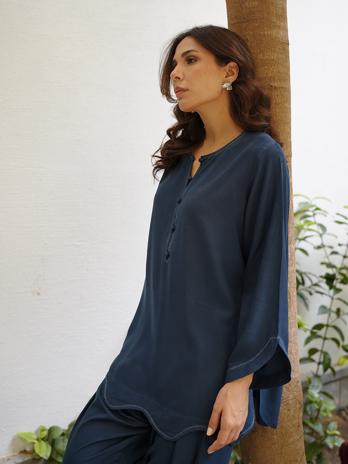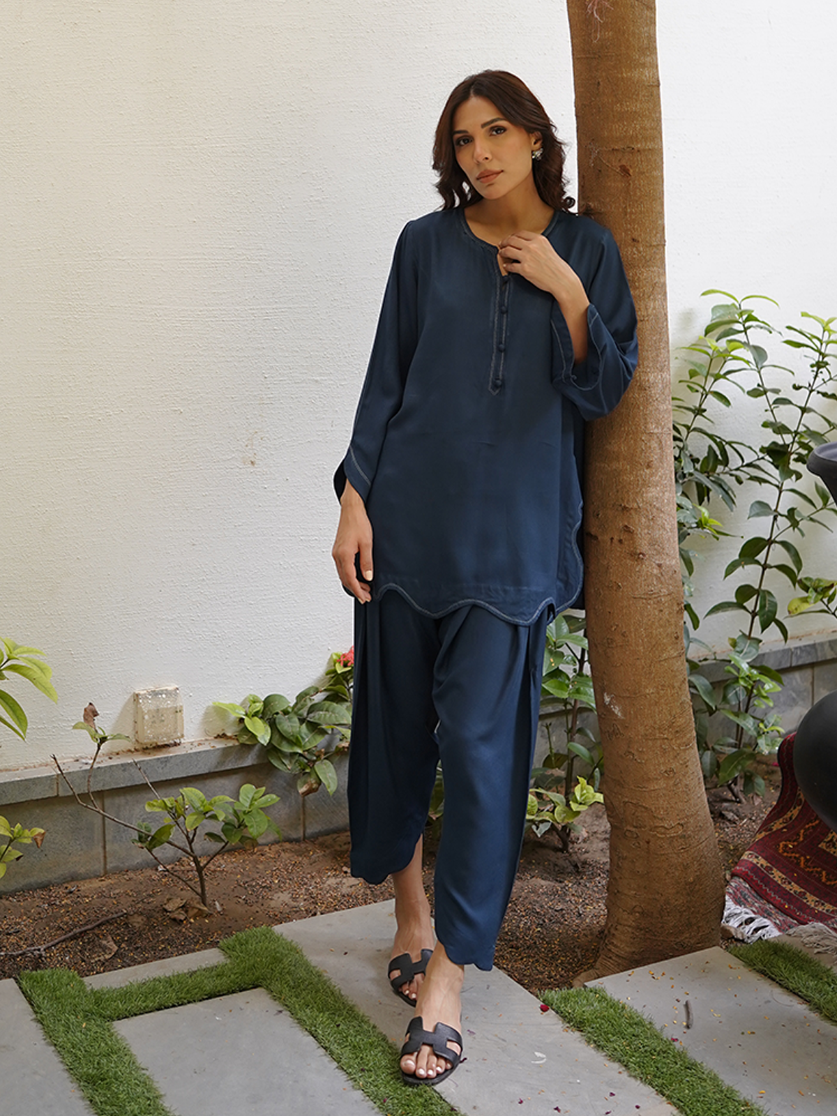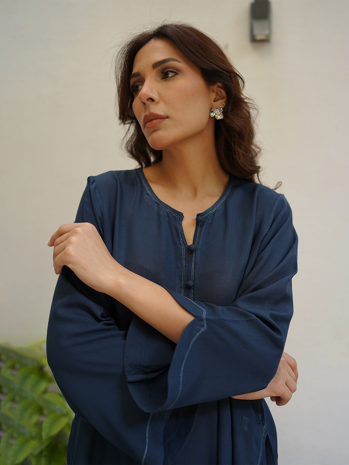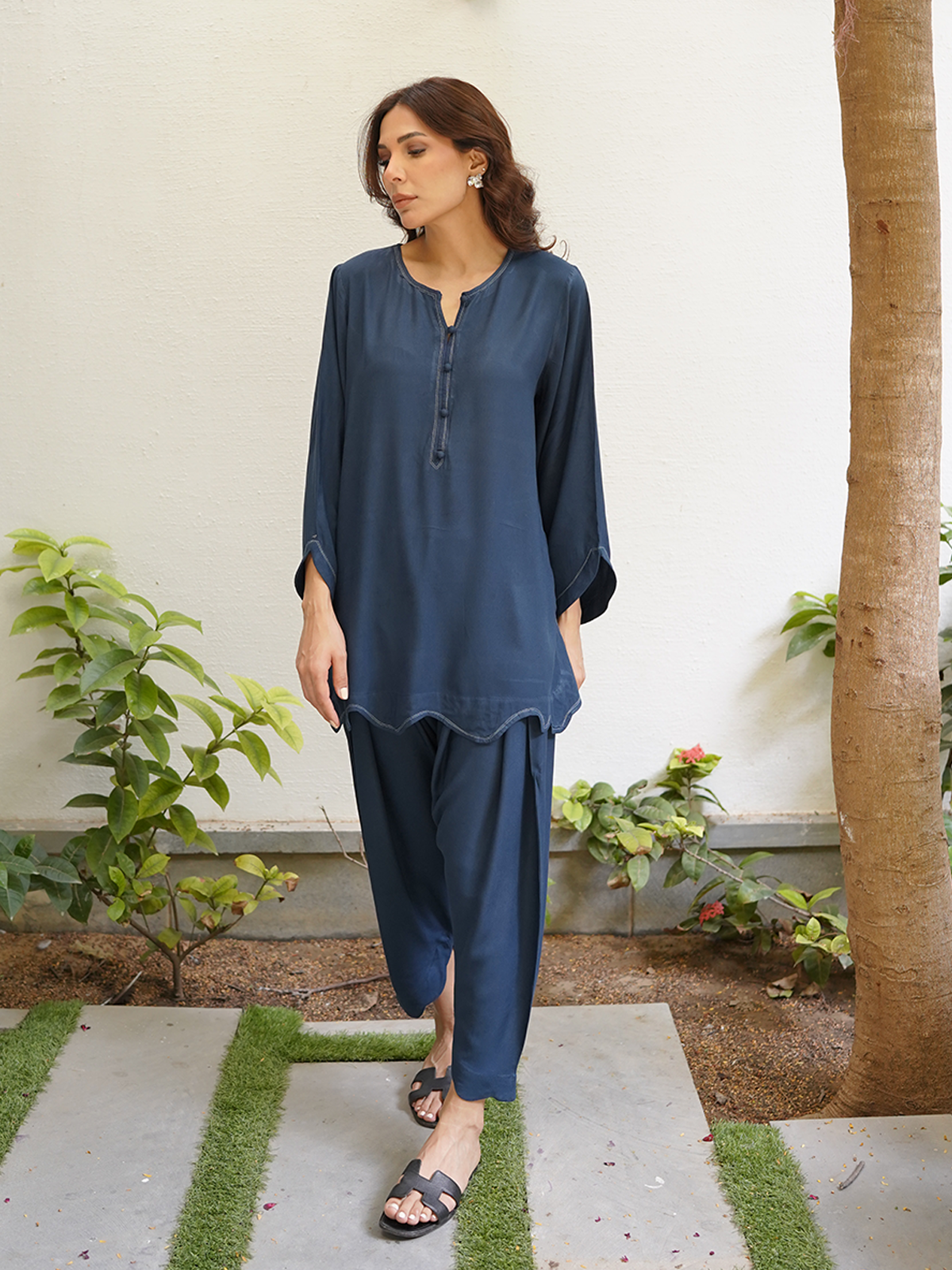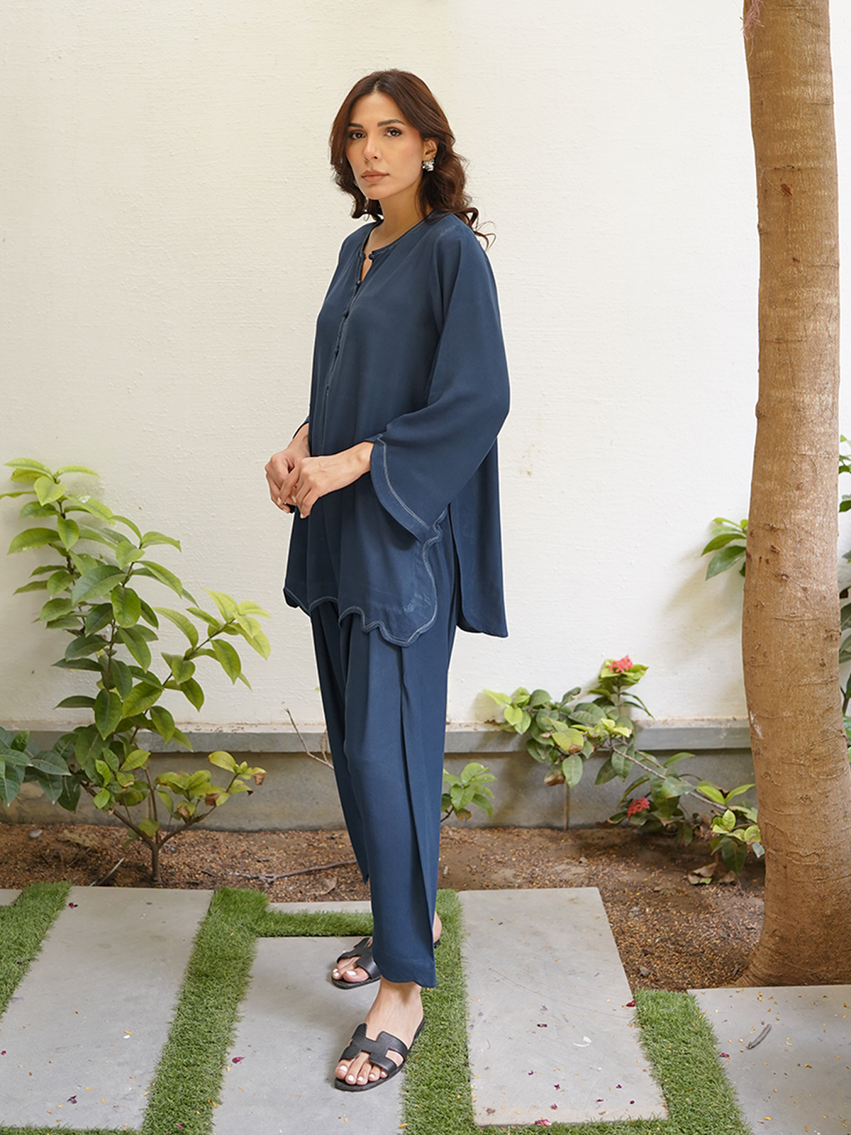 A deep blue boski linen set complete with thread work detailing along the neck, chaak, daaman and sleeves. Paired with our signature scalloped shalwar.