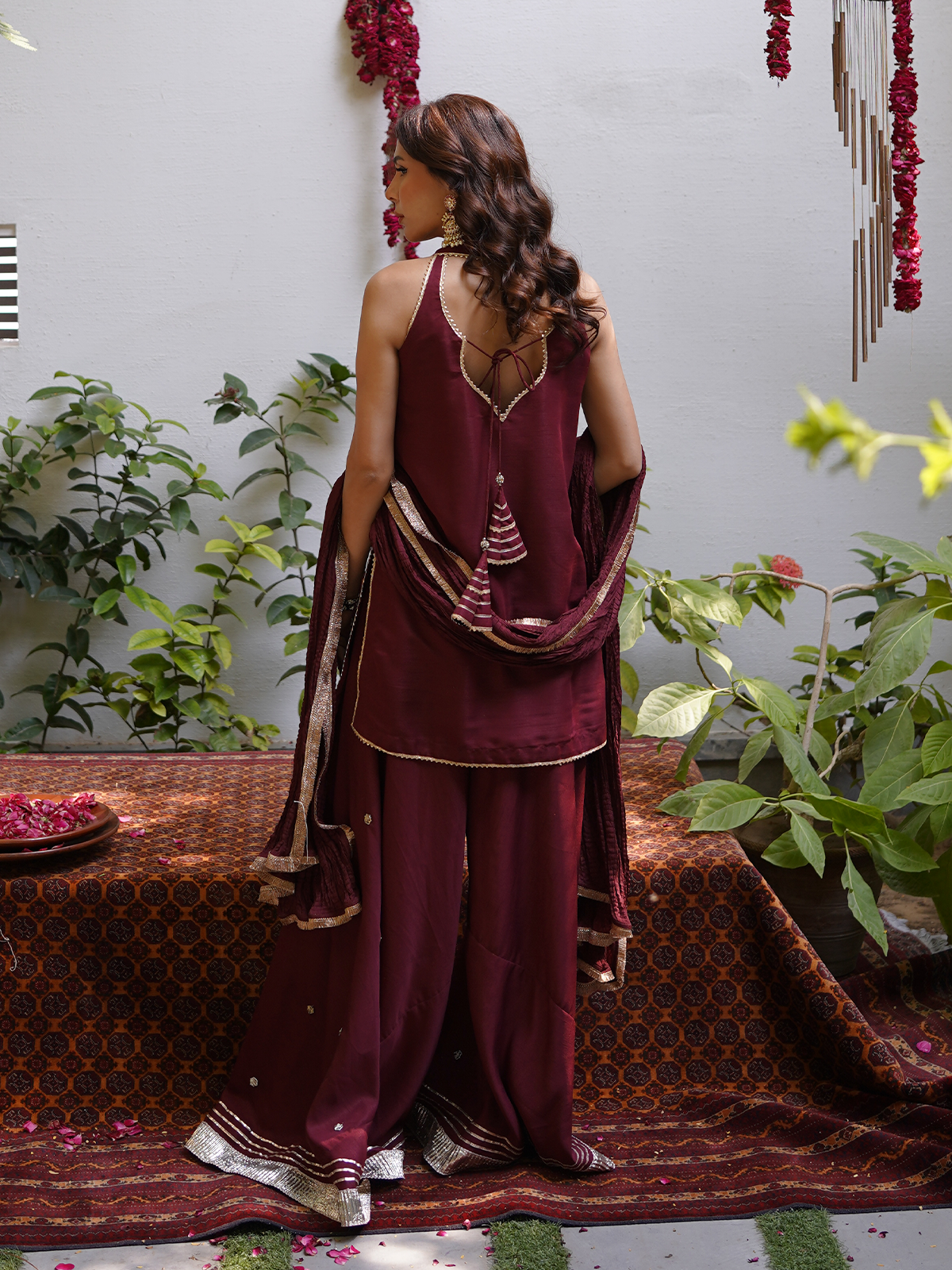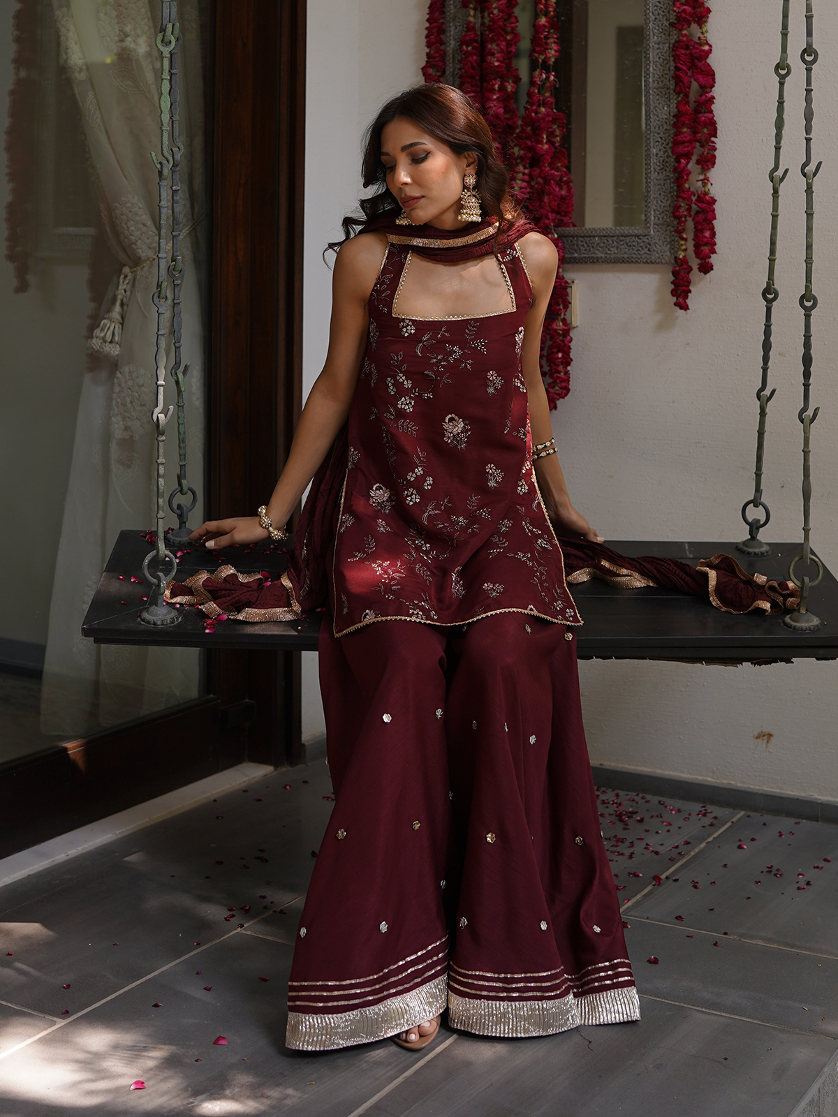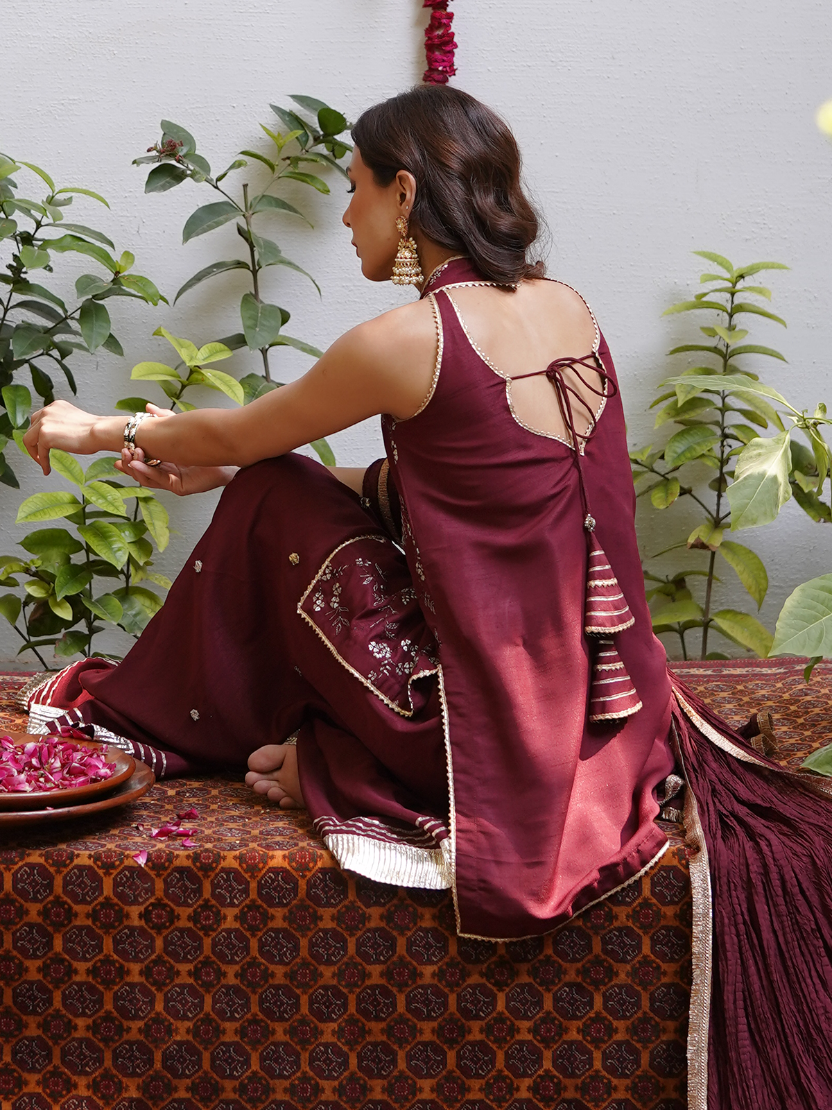 • Maroon Embroidered Raw Silk Shirt With Gota Detailing