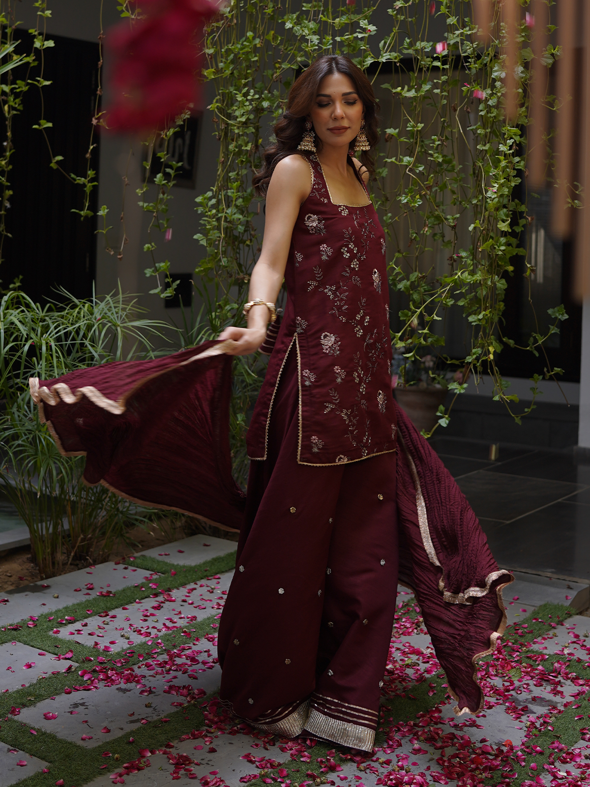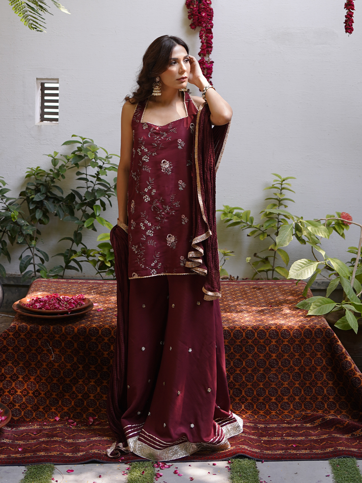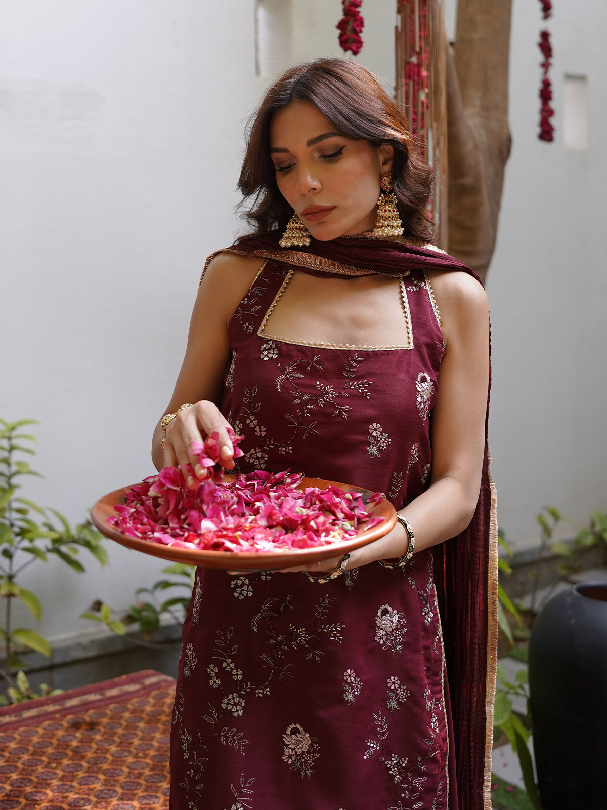 • Maroon Embroidered Raw Silk Shirt With Gota Detailing