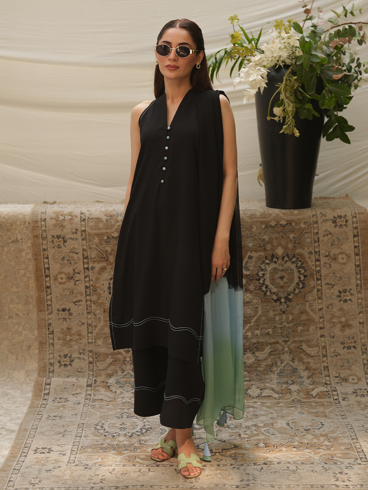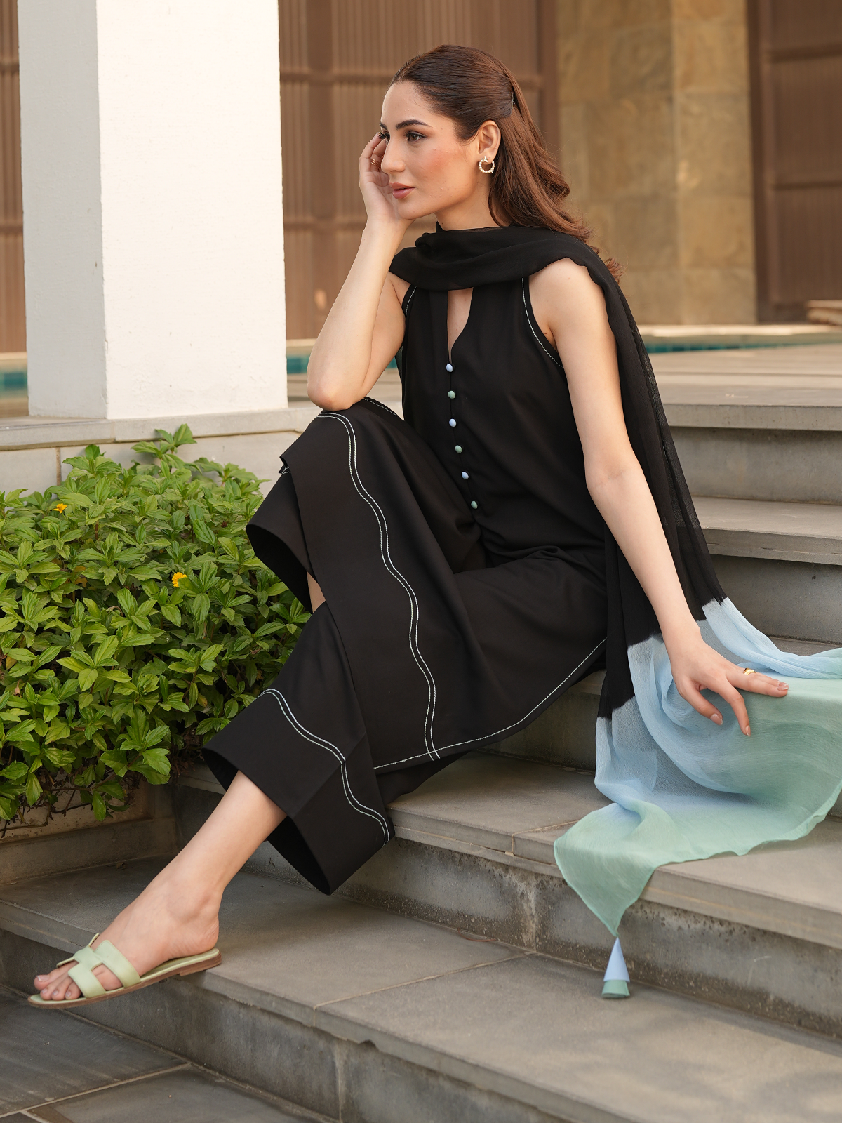 A halter neck black linen set with kaantha line embroidery in shades of pastel green and blue, azaar pants with kaantha stitch and a dip dyed dupatta.